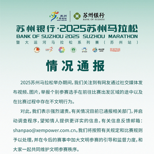 央视网消息:据“苏州马拉松”微信公众号消息,2025苏州马拉松举办期间,苏州马拉松组委会关注到有网友通过社交媒体发布视频、图片,举报个别参赛选手在前往比赛出发区域的途中以及在比赛过程中存在不文明行为。对此,我们表示强烈谴责。有关情况目前已通报相关部门,并启动调查程序。