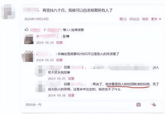 8月14日至10月29日,陈振至少4次表达了轻生想法。其中10月24日,他写道“再坚持8个月,我就可以✕✕报复所有人了。”评论区中,有人评论道,“你确定是报复吗?你只不过是别人的笑资罢了。”陈振回复道,“我活着是别人的校园欺凌的玩物,死了成为别人的笑柄,这是命中注定,我改变不了什么。”