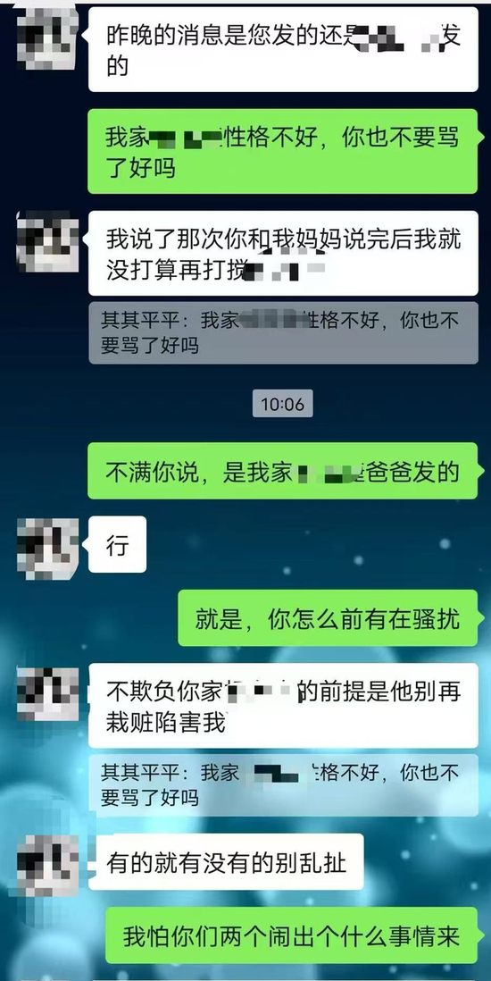 聊天记录显示,12月,陈振母亲的账号向雷鑫进行警告,雷鑫回复询问消息是不是陈振发的,陈振母亲表示是陈杰发的。雷鑫回复,“不欺负你家陈振的前提是,他别再栽赃陷害我。有的就有,没有的别乱扯。”