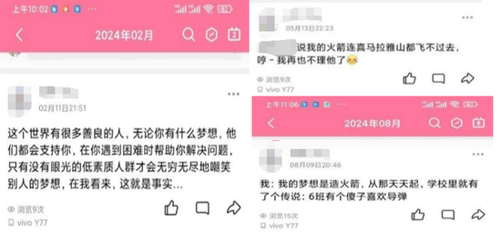 2024年3月至7月,陈振经常转载、发布关于火箭、埃隆马斯克、中国航天等相关的信息。期间,有关于憎恨同学雷鑫等;认为父亲看不起自己;被同学辱骂;老师认为他造不出火箭等言论。
