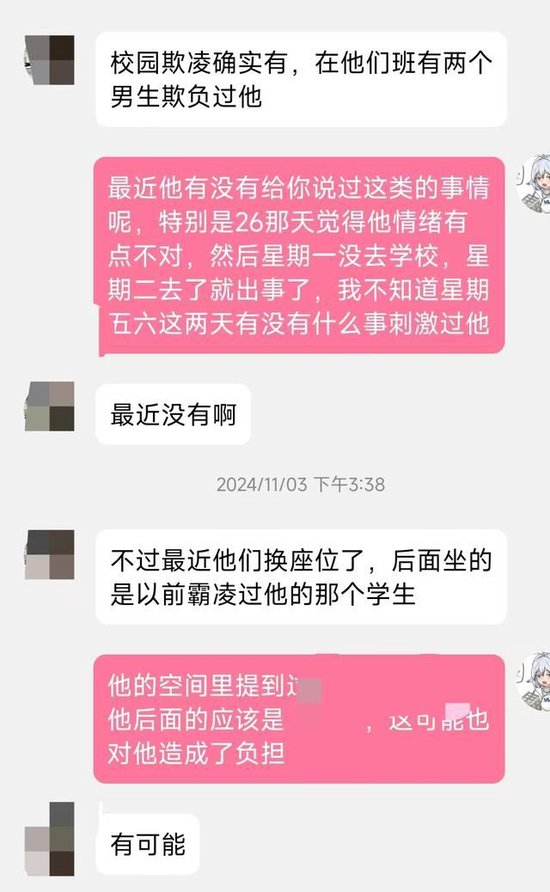 “这次事件发生后,先期是由校方进行了认定,但家属提出应由学校欺凌治理委员会介入调查,遂组成了37人的委员会,其中法制副校长、县法院副院长等校外人员有参与。”该负责人说,正式介入调查的时间为“11月12日”,经过委员会核查研判,认为不存在校园欺凌,“调查对象涉及班主任、科任老师、同桌等。”