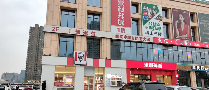 通过对三河市肯德基燕顺店及尚京广场店拍摄的实时照片显示,发现燕顺路店的肯德基的广告牌匾底色仍为红色;尚京广场的肯德基门店为红白相间的底色,暂时亦未整改。此外,记者注意到,在该门面旁还有一家“米村拌饭”门面,广告牌匾也是红色底图。