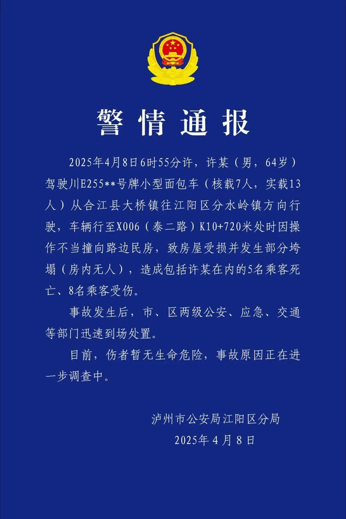 ·四川泸州一面包车撞向民房致5死8伤,事故具体原因正在进一步调查中。