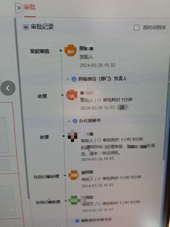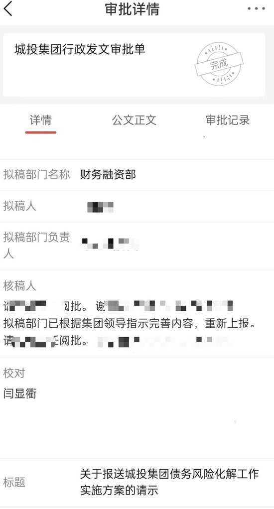 谢先生向记者提供了多份他在城发投和城投经办的行政发文审批,以及他在两家公司的工作文件、办公照片、和公司领导同事的工作对接记录等。公司内部系统截图显示,谢先生在城投隶属于综合办公室,并登记有员工号。