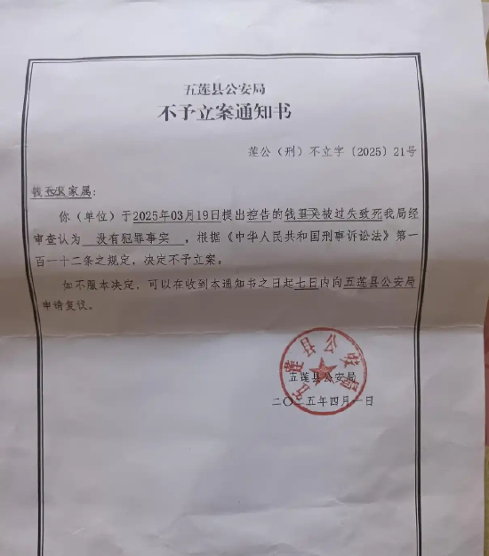 4月1日,五莲县公安局出具不予立案告知书显示,对家属3月19日提出控告的钱某被过失致死一案,经审查认为没有犯罪事实,决定不予立案。