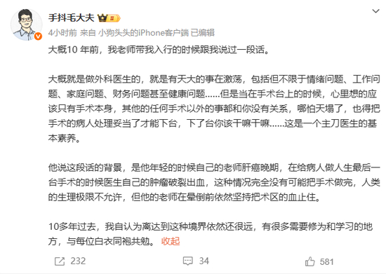 今天,另一名简介为“帝都某三甲医院”的博主“手抖毛大夫”则发文称:“大概10 年前,我老师带我入行的时候跟我说过一段话。大概就是做外科医生的,就是有天大的事在激荡,包括但不限于情绪问题、工作问题、家庭问题、财务问题甚至健康问题……但是当在手术台上的时候,心里想的应该只有手术本身,其他的任何手术以外的事都和你没有关系,哪怕天塌了,也得把手术的病人处理妥当了才能下台,下了台你该干嘛干嘛……这是一个主刀医生的基本素养。”