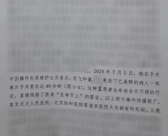 而更值得注意的是,肖飞的妻子在举报信中还写道:2024年7月5日,肖飞和该规培住院医师上手术,该规培住院医师的某些操作引起了手术室一位护士的斥责,肖飞对该护士大吼大叫,并丢下已经麻醉的病人不顾,和该规培住院医师一起离开手术室长达40分钟。