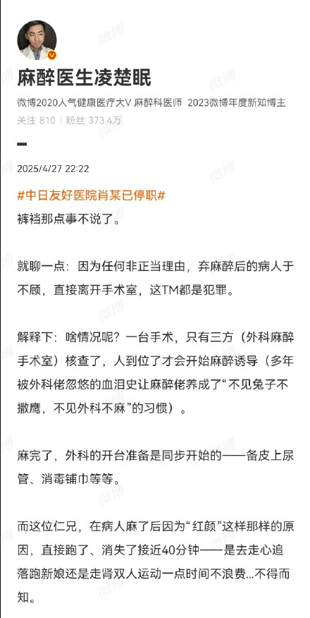 笔者注意到,4月27日晚,微博名为“麻醉医生凌楚眠”博主发文谈及该事件。其简介为:华中科技大学附属协和医院麻醉科医师、丁香园长期合作作者。他在文中写道,肖飞事件中,涉及的手术因为他个人原因“卡住了”,所有医护工作者都无法推进手术,排在后面的手术病人也被迫延误,手术台上的病人也陷入到危险中……“因为任何非正当理由,弃麻醉后的病人于不顾,直接离开手术室,都是犯罪”。