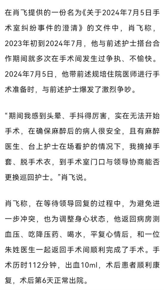 在肖飞提供给《经济观察报》的一份名为《关于2024年7月5日手术室纠纷事件的澄清》的文件中,肖飞称,2024年7月5日,他带前述规培住院医师进行手术准备时,与护士(举报信中提及的手术室护士)爆发了激烈争吵。“期间我感到头晕、手抖得厉害,实在无法开始手术,在确保麻醉后的病人很安全,且有麻醉医生、台上护士在场看护的情况下,我摘掉手套、脱手术衣,到手术室门口与领导协商能否更换巡回护士。”