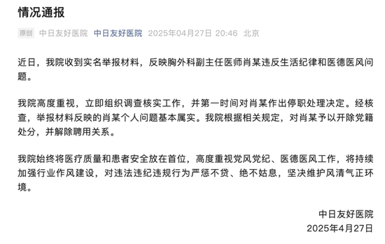 婚内出轨多名医护人员,且存在因情感原因置已被麻醉患者不顾,长时间离开手术室情况。4月27日,中日友好医院就此事发布了情况通报: