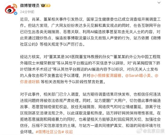 近日,肖某、董某相关事件引发热议,国家卫生健康委也已成立调查组开展调查工作。但站方发现,广大网友纷纷表达多元见解和真实观点的同时,在各互联网平台已衍生出各类无端揣测、恶意关联、利用AI编造故事甚至攻击无关人士的内容,对此类通过蹭炒热点、编造故事博取流量以及无故毁人声誉的行为,站方依据《微博社区公约》等相关规定予以严厉打击。