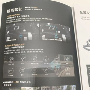 位于北京市昌平区超级合生汇商场的小米汽车门店内,新黄河记者获取到一份介绍小米汽车的纸质宣传册,在该宣传册上仍保留了“xiaomiHAD端到端全场景智能驾驶”等介绍。而摆放在一侧的“小米汽车无忧服务包”海报上并未提及“智驾”或者“辅助驾驶”的相关内容,除此之外,门店内鲜有其他公开的宣传物料。