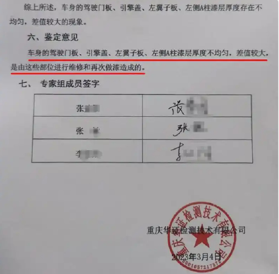 2023年3月4日,该公司出具《产品质量鉴定意见书》称,经专家鉴定发现车身的驾驶门板、引擎盖、左翼子板、左侧A柱漆层厚度不均匀,差值较大,“是由这些部位进行维修和再次做漆造成的。”