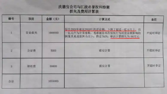 华商报大风新闻记者在“庆德宝”的一张“损失及费用计算表”中看到,其罗列的营业损失为100万元,计算方式是“庆德宝”2024年相比2023年的营业额下降了超过一亿元以上,“以一亿元作为计算基数,考虑被告本次侵权行为对营业额影响的因果关系及原因力大小,酌定为1%,据此计算损失为100万元。”
