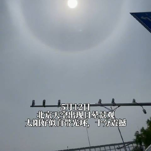 [#什么是日晕# ]#北京出现日晕天象# 5月12日,北京天空出现日晕景观,太阳好似自带光环。