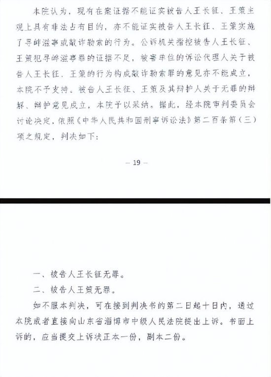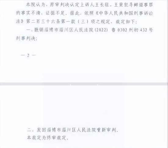 2024年4月17日,淄博市中院《刑事裁定书》认为,王长征、王策犯寻衅滋事罪的事实不清、证据不足:撤销淄川区法院《刑事判决书》,发回淄川区法院重新审判。