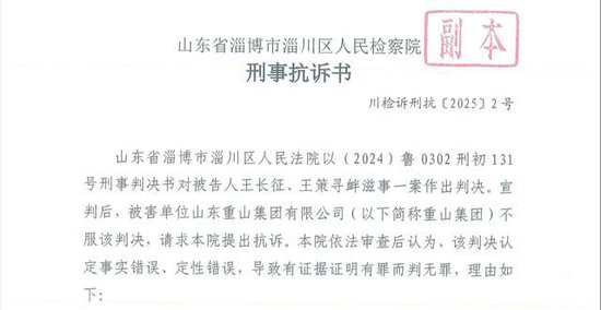 4月30日,淄川区检察院向淄博市中院提起抗诉。《刑事抗诉书》显示,重山集团不服判决,请求本院提出抗诉。本院依法审查后认为,该判决认定事实错误、定性错误,导致有证据证明有罪而判无罪,理由如下: