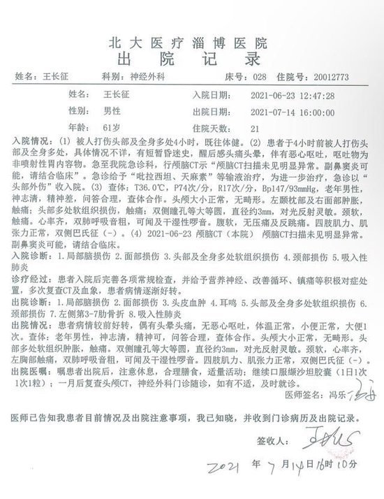 6月23日,王长征与山东重山集团保安陈某发生冲突。7月14日的《出院记录》显示,6月23日中午12时47分,王长征入院。出院诊断为“局部脑损伤、面部损伤、头皮血肿、耳鸣、头部及全身多处软组织损伤、颈部损伤、左侧3-7肋骨骨折等”。