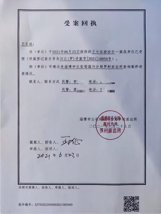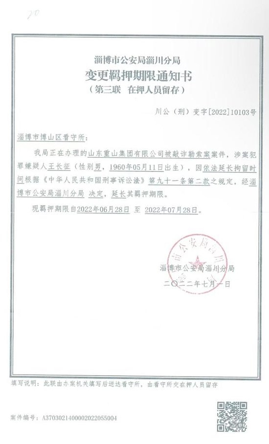 2022年6月1日,淄博公安淄川分局以敲诈勒索立案。6月27日,王长征、王策被抓捕归案。