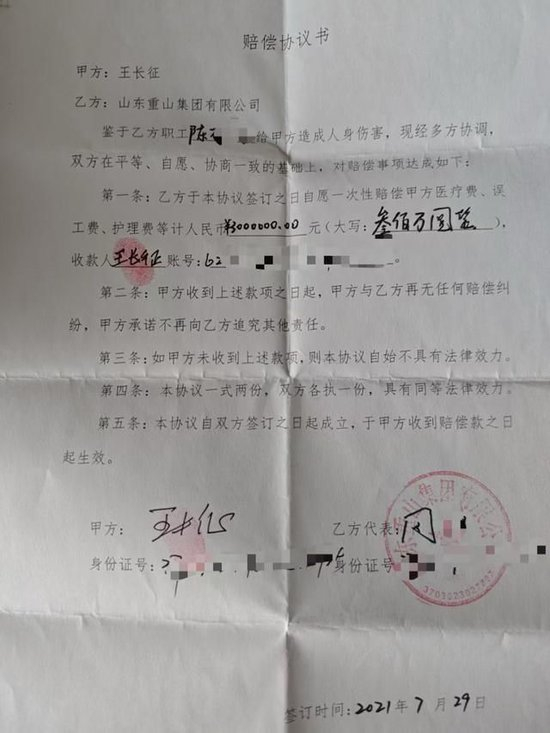 2021年7月29日,王长征与山东重山集团有限公司签订《赔偿协议》称,山东重山集团员工陈某给王长征造成人身伤害,经多方协调,山东重山集团于协议签订之日,自愿一次性赔偿王长征医疗费、误工费、护理费等计人民币300万元。王长征收到上述款项起,双方再无任何赔偿纠纷,王长征不再向山东重山集团追究其他责任。