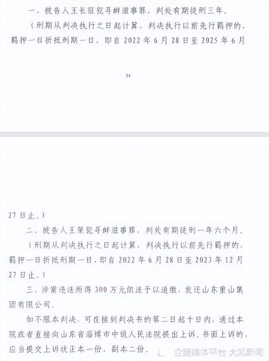 2023年12月21日,淄川区法院一审判决,长征犯寻衅滋事罪,判处有期徒刑三年;王策犯寻衅滋事罪,判处有期徒刑一年六个月。涉案违法所得300万元依法予以追缴,发还山东重山集团。