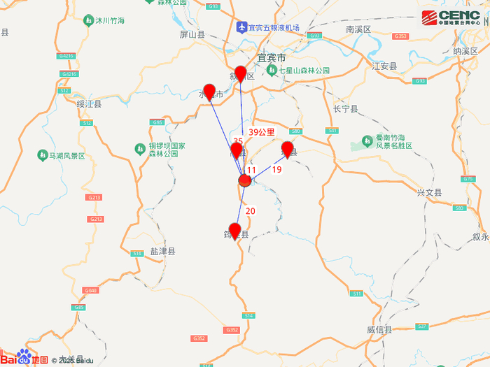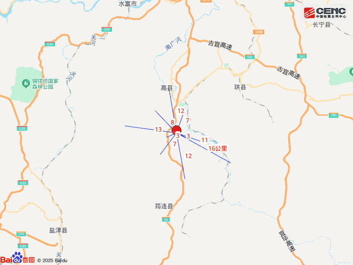 周边县城:震中距高县11公里、距珙县19公里、距筠连县20公里、距云南水富市35公里、距叙州区39公里,距宜宾市47公里,距重庆市238公里。
