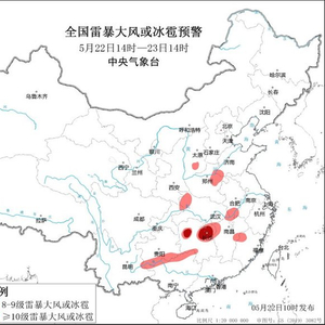 预计5月22日14时至23日14时,山西南部、河南东部、湖北西北部、安徽西南部、湖南北部和西南部、江西北部、贵州南部、福建西北部、广西北部等地的部分地区将有8级以上雷暴大风或冰雹天气,其中,湖南北部等地的部分地区将有10级以上雷暴大风,最大风力可达11级以上;山西南部、河南东部和南部、安徽中南部、江苏南部、上海、浙江北部和西部、湖北中东部、湖南中北部和西南部、江西中北部、福建中北部、贵州南部、四川南部、云南东南部、广西、广东西部、海南岛北部等地的部分地区将有小时雨量大于20毫米的短时强降水天气,其中,安徽西南部、湖北东部、湖南北部、江西北部、贵州南部、广西西北部等地的部分地区小时雨量大于50毫米,最大可达80毫米以上。