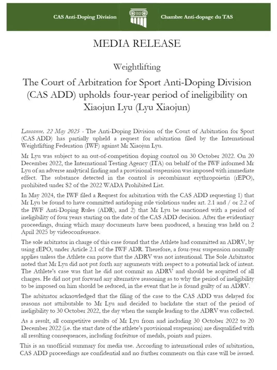 瑞士洛桑时间5月22日,国际体育仲裁院反兴奋剂部门发布裁决声明,维持对中国举重运动员吕小军的四年禁赛处罚,禁赛期提前至2022年10月30日开始。