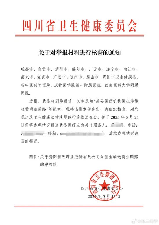 通知称,被举报存在行贿行为的企业系贵阳新天药业股份有限公司成都分公司。