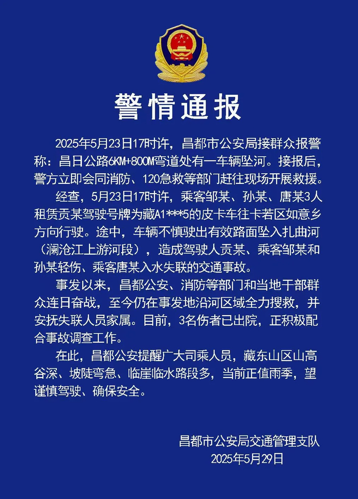 事发以来,昌都公安、消防等部门和当地干部群众连日奋战,至今仍在事发地沿河区域全力搜救,并安抚失联人员家属。目前,3名伤者已出院,正积极配合事故调查工作。