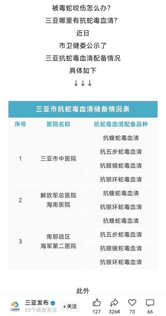 三亚公布的抗蛇毒血清医院信息(三亚发布官方账号截图)