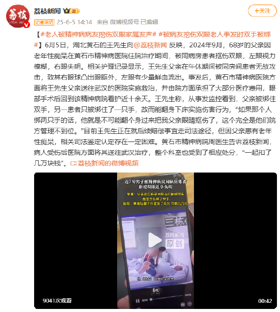 [#老人被精神病友挖伤双眼家属发声# #被病友挖伤双眼老人事发时双手被绑#]6月5日,湖北黄石的王先生向@荔枝新闻 反映,2024年9月,68岁的父亲因老年性痴呆在黄石市精神病医院住院治疗期间,被病友抠伤双眼,左眼视力模糊,右眼失明。相关护理记录显示,患者在午休期间被同房间患者无故攻击,致其右眼球凸出眼眶外,左眼有少量鲜血流出。事发后,院方将王先生父亲送往武汉的医院实施救治,并由黄石市精神病医院方面承担了大部分医疗费用,眼部手术后回到该精神病院看护近十余天。王先生称,从事发监控看到,父亲被绑住双手,另一患者只被绑住了一只手,故而能翻身下床实施伤害行为,“如果那个人绑两只手的话,他就是不可能翻个身过来把我父亲眼睛抠伤了,这个完全是他们院方管理不到位。”目前王先生正在就后续赔偿事宜走司法途径,但因父亲患有老年性痴呆,相关司法鉴定认定存在一定困难。黄石市精神病院周医生告诉荔枝新闻,病人受伤后医院方面将其送往武汉治疗,整个科室也受到了相应处分,“一起扣了几万块钱”。