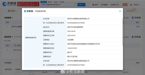 黄杨钿甜父亲关联公司拟注销,此前因失联被列经营异常,黄杨钿甜父亲已卸任法定代表人