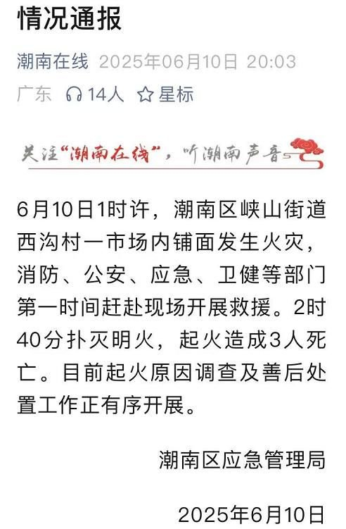 6月10日晚,潮南区应急管理局通报称,10日1时许,汕头市潮南区峡山街道西沟村一市场内铺面发生火灾,消防、公安、应急、卫健等部门第一时间赶赴现场开展救援。2时40分扑灭明火,起火造成3人死亡。目前起火原因调查及善后处置工作正有序开展。