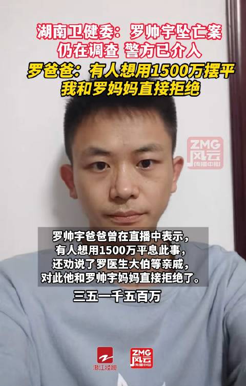 中南大学湘雅二医院实习医生罗帅宇离奇坠亡,家属恢复电脑数据,现40余万元异常转账及医疗腐败相关举报材料,引发广泛关注。罗帅宇爸爸曾在直播中表示,有人想用1500万元平息此事,还劝说了罗医生大伯等亲戚,对此他和罗帅宇妈妈直接拒绝了。6月12日,湖南省卫健委信访部门回应称,信访材料确已受理,医疗腐败问题的事项已经移交公安机关,仍在调查核实。