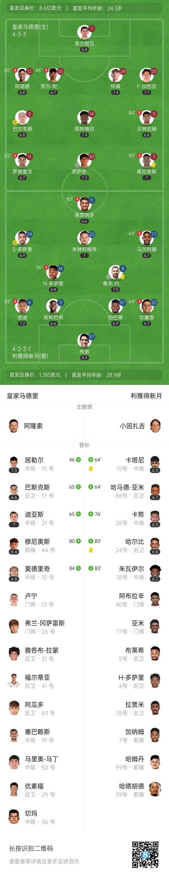 第34分钟,皇马教科书反击,维尼修斯、巴尔韦德连续做球,罗德里戈送出精妙斜塞,年仅21岁的冈萨洛包抄破门,皇马1-0领先↓