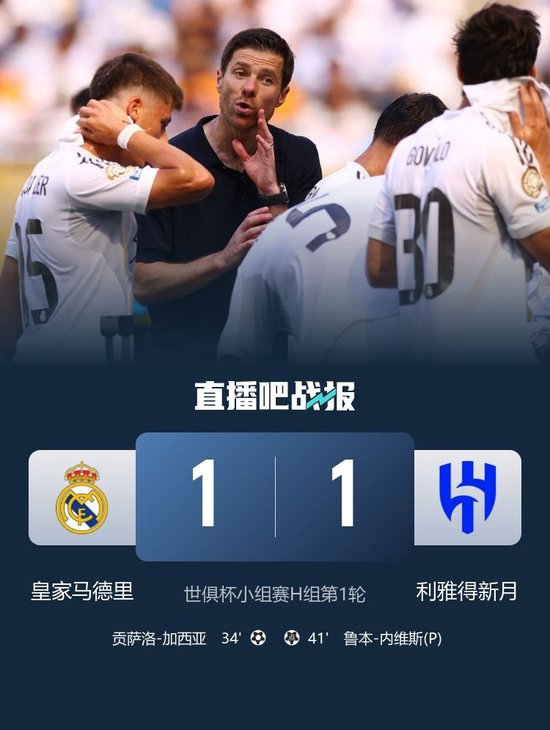 直播吧6月19日讯 世俱杯小组赛H组第1轮,皇家马德里对阵利雅得新月,比赛在迈阿密硬石体育场进行。上半场,21岁小将贡萨洛破门,洛迪进球被吹,阿森西奥送点内维斯点射命中。易边再战,居勒尔中框,巴尔韦德补时失点。最终皇马1-1新月。