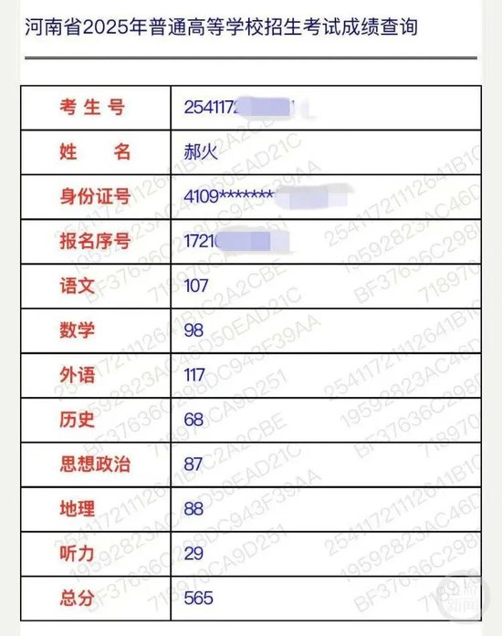 成绩单显示,郝火语文成绩107分、数学98分、外语117分(其中听力29分)、历史68分、思想政治87分、地理88分,总成绩565分。据悉,2025年河南高考普通类本科分数线历史类为471分,郝火的成绩超历史类本科分数线近100分。