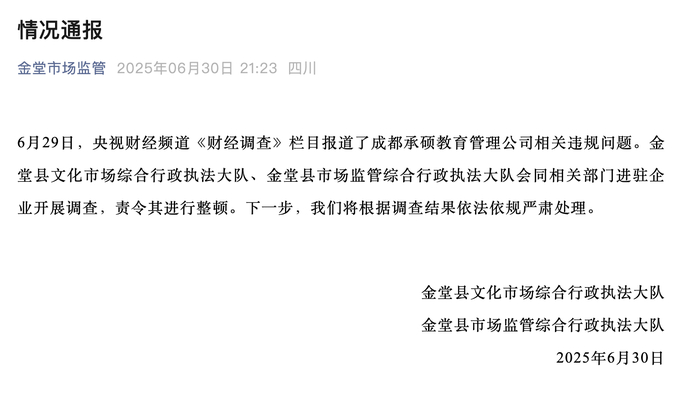 ·四川金堂通报成都承硕教育管理公司相关违规问题:责令整顿。