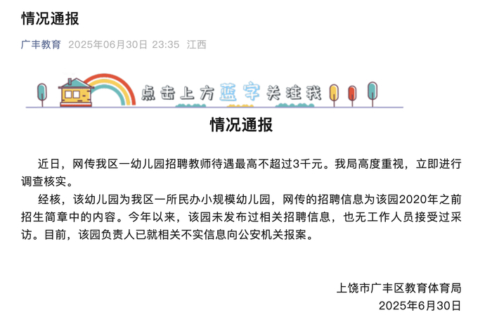 ·网传江西广丰区一幼儿园招聘教师待遇最高不超3000元,当地教体局回应:不实。
