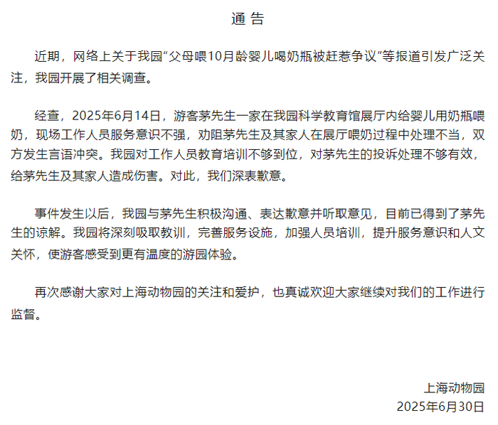 ·上海动物园回应“父母喂10月龄婴儿喝奶瓶被赶”:深表歉意。