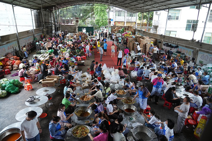 6月29日,群众在贵州省榕江县忠诚镇后勤伙食保障点准备食材,供应救灾点和群众安置点。