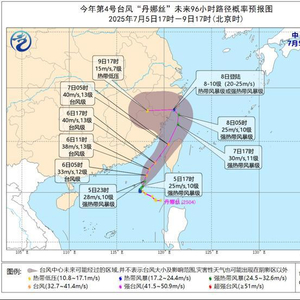 降水预报:7月5日20时至6日20时,台湾岛等地的部分地区有大到暴雨,其中,台湾岛南部的部分地区有大暴雨或特大暴雨(250~350毫米)。