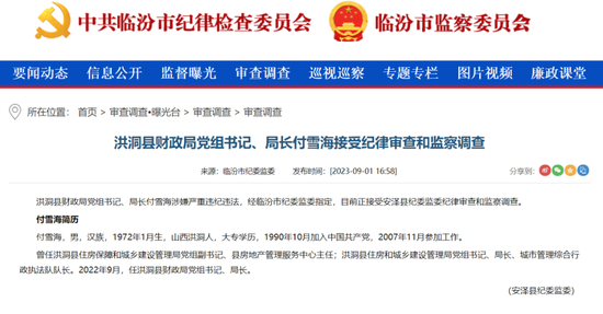 2023年9月1日,付雪海涉嫌严重违纪违法,经临汾市纪委监委指定,接受安泽县纪委监委纪律审查和监察调查。网络截图