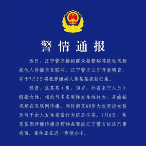 近日,江宁警方接到群众报警称其隐私视频被他人传播至互联网。江宁警方立即开展调查并于7月5日将犯罪嫌疑人焦某某抓获归案。