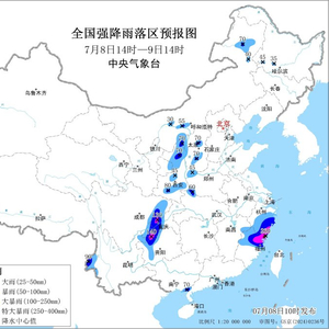 降水预报:7月8日14时至9日14时,浙江中南部和东部、福建北部等地有大到暴雨,其中,浙江东南部、福建东北部等地的部分地区有大暴雨,局地特大暴雨(250~260毫米)。