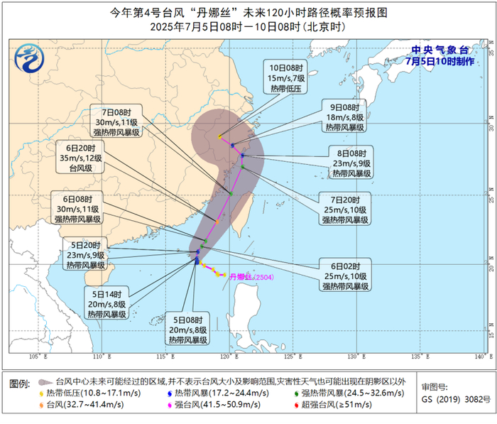 大风预报:7月8日14时至9日14时,东海及钓鱼岛附近海域、台湾以东洋面、浙江沿海、福建沿海、上海沿海、江苏东南部沿海、长江口区、台湾岛沿海、广东东部沿海、台湾海峡、巴士海峡、南海东北部和西南部将有6~7级大风,其中“丹娜丝”中心经过的附近海域和地区风力可达8~9级、阵风10~11级。