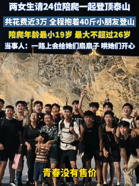 近日,两位女子请24位陪爬一起登顶泰山,花费近3万元。陪爬年龄最小19岁,最大不超过26岁。