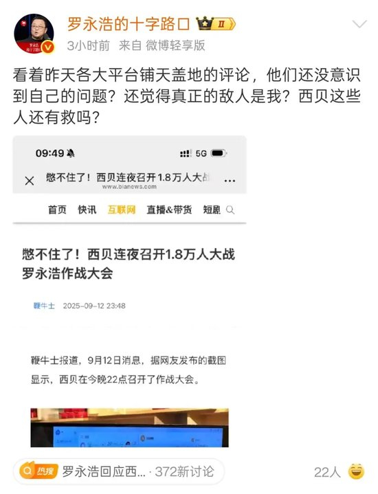 记者注意到,罗永浩本人也对此事做出回应。他在个人微博发布“作战大会”的截图并评论道:“看着昨天各大平台铺天盖地的评论,他们还没意识到自己的问题?还觉得真正的敌人是我?西贝这些人还有救吗? ”