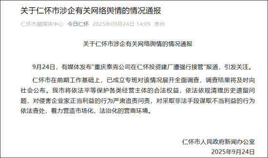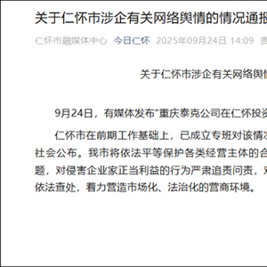 刚刚,贵州省仁怀市人民政府新闻办公室发布关于仁怀市涉企有关网络舆情的情况通报: